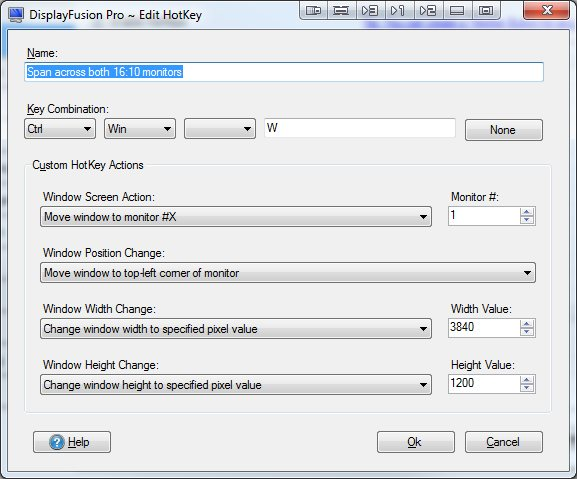 See the attachment for the actual settings, but essentially you move the window to the top-left of the left-most monitor in the pair (centre one for you) and then make the width equal to the combined width of the two montiors you want to span.