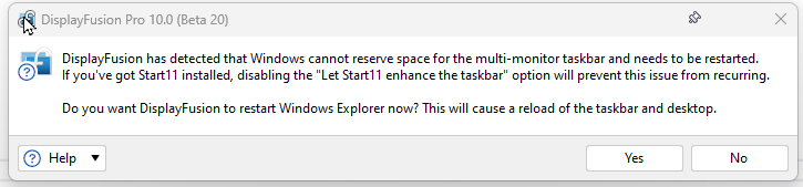 Overnight, I lock my PC which blanks out my screens(via a DF trigger). My primary monitor is a TV, so it will power off completely after maybe 10 minutes. When I wake up, I turn on the TV, wake the screens and unlock the PC. Today, I saw this message waiting for me... but there was nothing wrong with the taskbar keepout area, so I clicked no. I'm suspecting that I'm going to see this message every day unless I disable it in the advanced settings.
