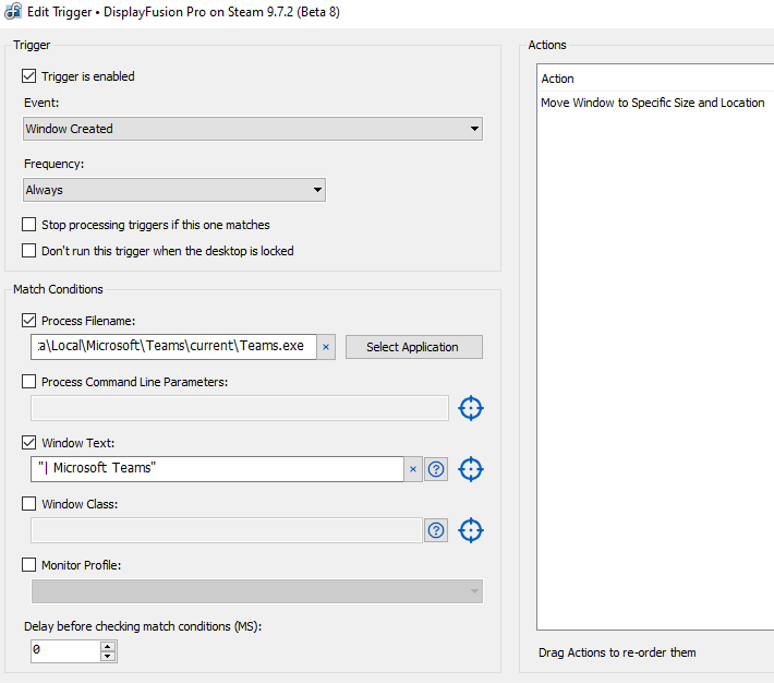 BUT, when MS teams is starting, the splash screen is detected and DisplayFusion is applying the trigger to position the splash screen instead of the main screen that appears right after that.