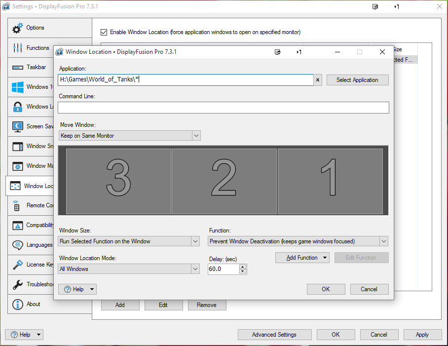 The main reason why I want to run either program is because I have my game (World of Tanks) on my main 42" screen, and run FF and TS on the second 24" and when I click on the second monitor the game minimizes. That just completely defeats the purpose of having two monitors IMO. So I installed the trial-pro version of display fusion. I tried the instructions found here: http://www.displayfusion.com/KB/PreventWindowDeactivation/