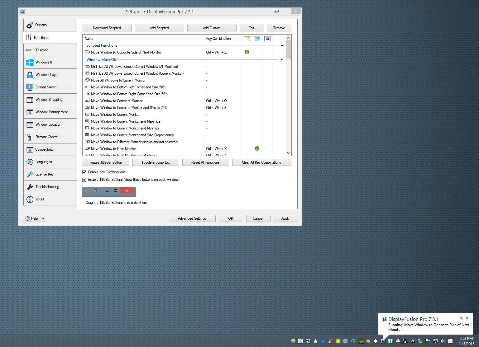 Figured it out, but I'm not sure if this is what I want. Enabled "Don't Show Tray Icon Notification Balloons" in Advanced Settings, so the balloons don't appear when toggling Scripted Functions. But now I won't get notification balloons when Displayfusion alerts for updates right?