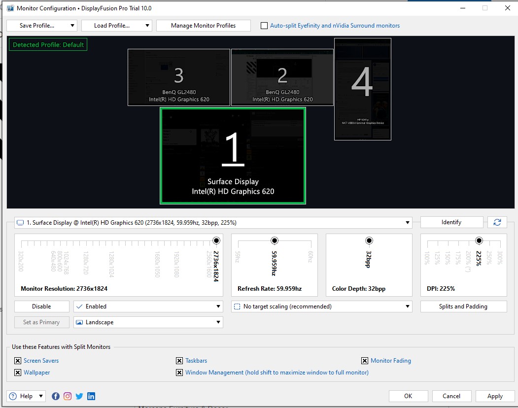 Thanks for sending that over, it looks like the DisplayFusion configuration matches the Windows one. If you click the "Identify" button, do the monitor ID's match to where your physical monitors are?