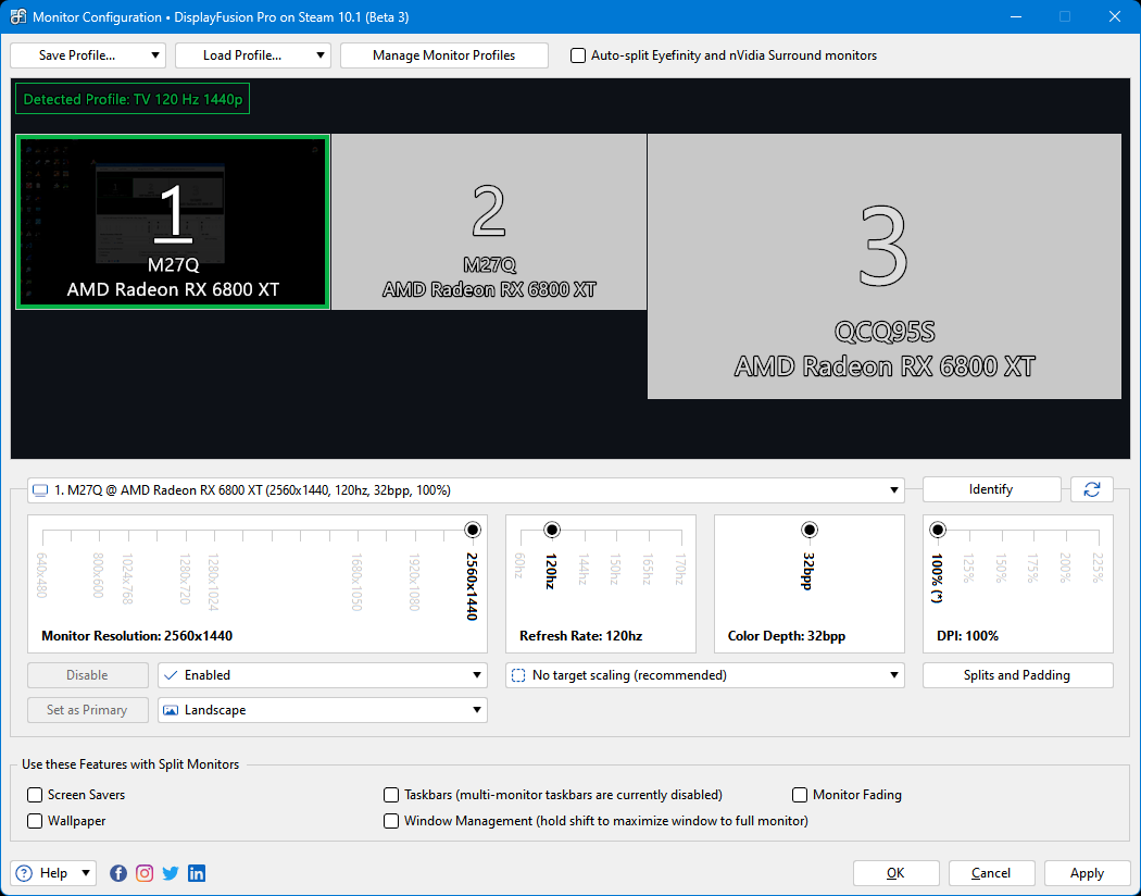 I have 2 monitors (M27Q) and a TV. I want to have a profile for 2560x1440/120 Hz/100% scaling on my primary monitor and another profile with the same resolution/refresh/scaling combination also for the TV. However there is a bug (tested on latest v10 stable and also tried the latest v10.1b3 beta) that detects 2560x1440/120 Hz/100% on the monitor as the TV profile (if the TV profile already exists) and vice versa (so 2560x1440/120 Hz/100% on the TV is detected as the monitor profile if it already exists). Selecting the already the already selected/highlighted profile from the tray menu correctly sets the profile, so it seems there is just some kind of bug in detecting distinct (multi)monitor profiles.