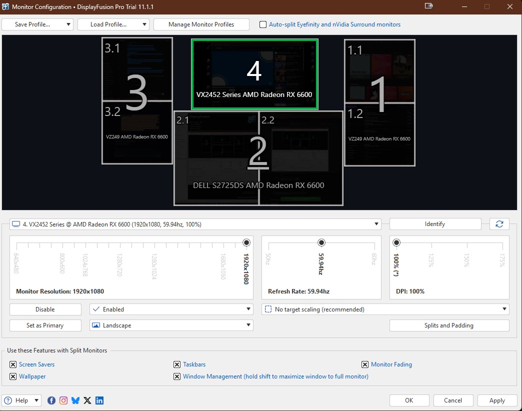 Hi everyone. I’m a home user running DisplayFusion Pro Trial 11.1.1 on Windows 11, and I’m trying to solve a mouse‑movement issue with my four‑monitor setup. I’ve attached a screenshot of my Monitor Configuration so you can see the layout.