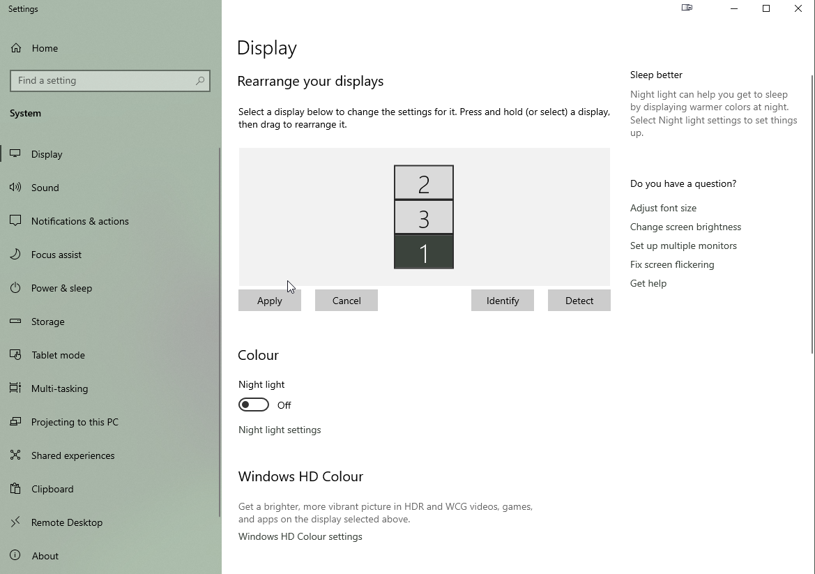 You should now see how your desktop layout looks to Windows. You can drag these screens to the layout you want, click Apply to test your settings and drag the displays around to get your desired setup.