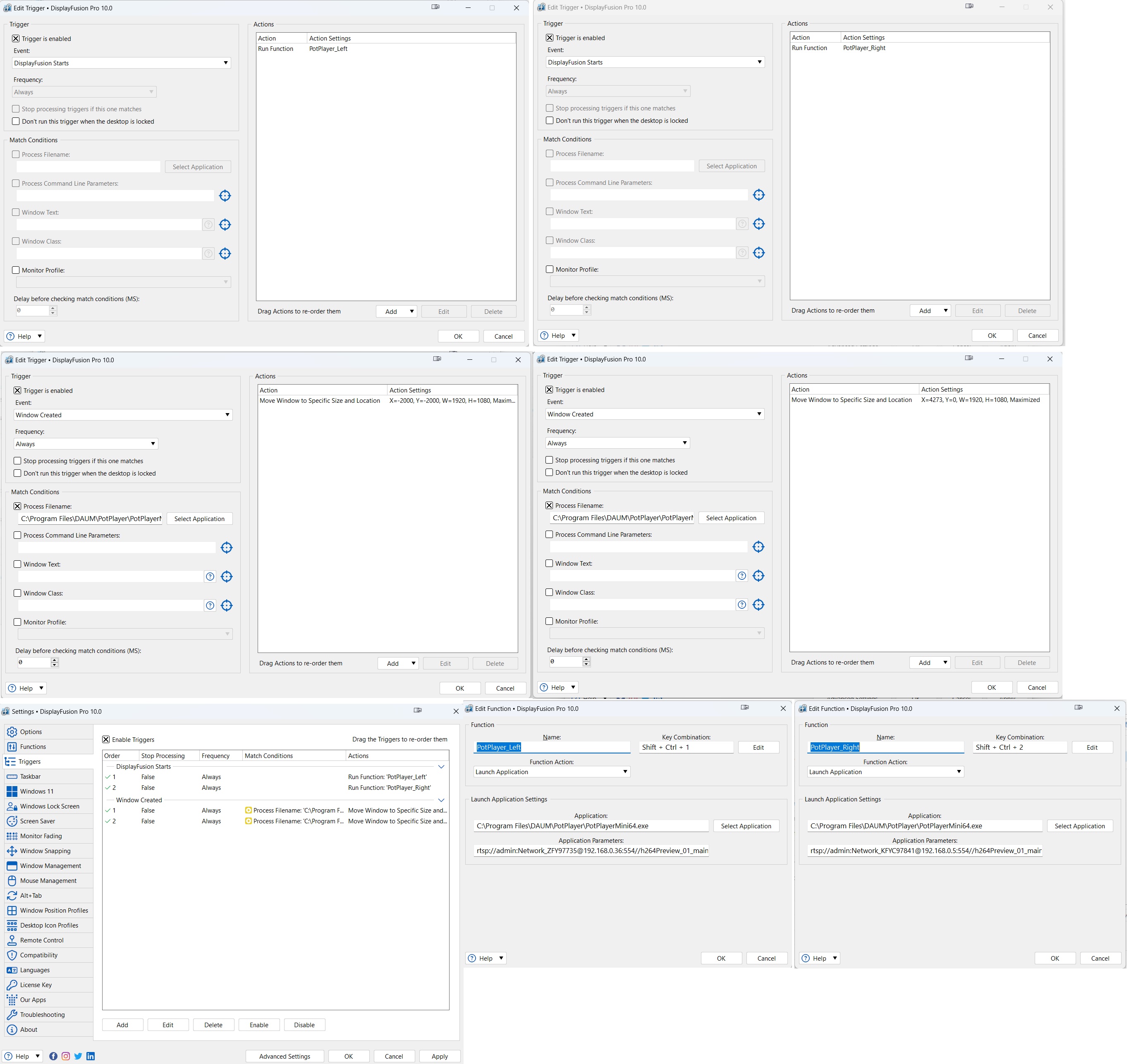 I have one 4k and two 1920x1080 monitors. The 4k is controlled by a GTX 750Ti and the other two are controlled by a GTX 1050Ti. I'm trying to load a copy of PotPlayer on both of the 1920x1080 monitors. I can manually do it, but DisplayFusion won't do it for me using functions/triggers. I believe it's because I'm using two different video cards and DF can't tell where the monitors are. I've fiddled around with the X and Y coordinates, but no matter what I input I can only get them to display on one of the 1920x1080 monitors or my 4K monitor. Anyone have any suggestions? I've attached a pic of what it's suppose to look like.