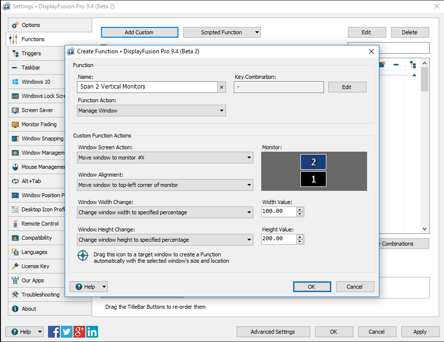 I played around with the other function that lets me open the window on coordinates ("Move window to specified location") but when I use 0 for x it starts the window at taskbar width. When I try to correct I can get it to have its left top more to the left but it seems the 100% is done before the top left since the width is not full screen width anymore, still the width of 100% - taskbar width.