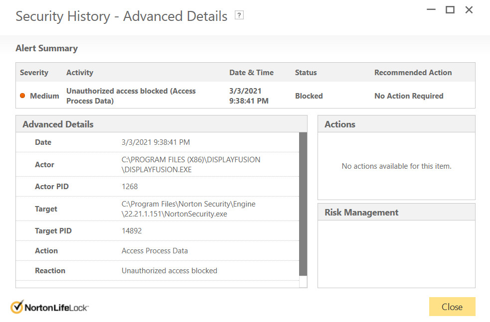 Every couple of minutes Norton history shows displayfusion as trying to access data (see screenshot). Can someone please explain what the program is trying to do and why Norton might be blocking it as a threat? I have noticed this for a long time on numerous installs of Win 10, just asking now (i.e. its not related to virus definition versions or displayfusion program versions).