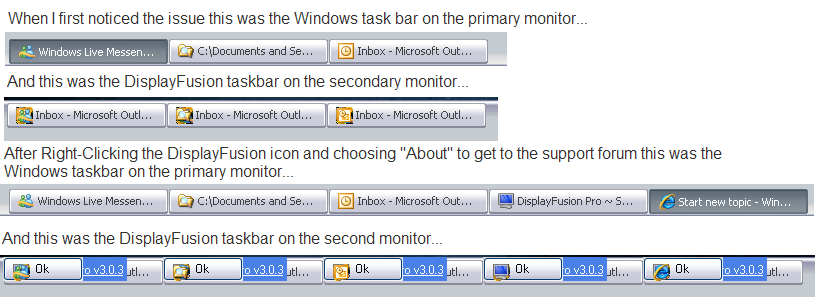 Attached are some screenshots of some task bar strangeness that just occurred on my WinXP SP2 machine.