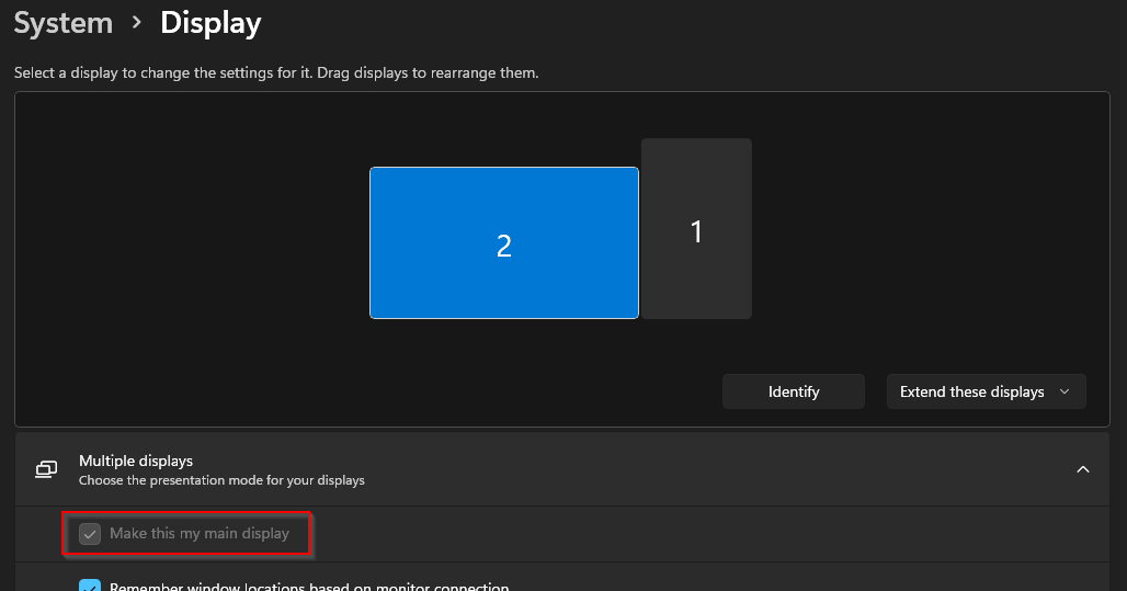 Currently, I am having to use the Windows "Show only on 1" option which is really annoying because I have to switch this everytime I change monitors.