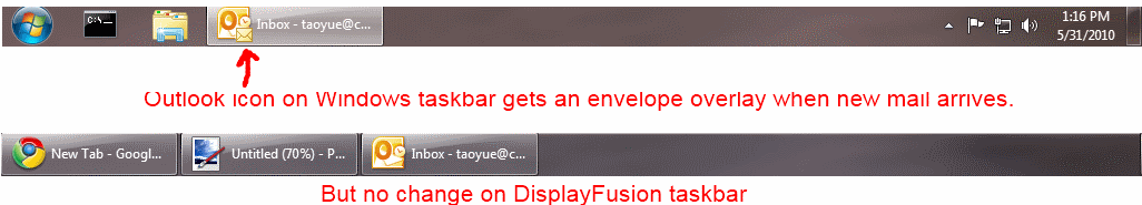 However, this is not the case for the DisplayFusion taskbar, which continues to display the original icon, without the overlay. This is true even if you start Outlook on the main taskbar and then move it to the monitor with the DisplayFusion teaskbar -- DisplayFusion seems to be using a different source for the icon.