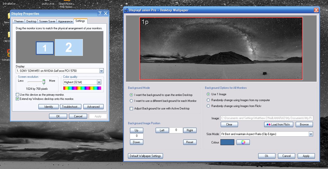 I just got Tight VNC working on my workstation, but apparently there is a conflict with where DisplayFusion takes its monitor information from. As the attached photo shows, Display Fusion thinks that I have one big monitor, while Windows Display Properties shows my two mis-matched monitors. While this usually wouldn't be an issue, it takes away the ability to fine tune the height offset between the two monitors.