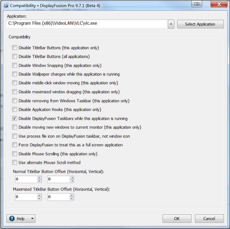 Oh hah, sorry about that! I had changed my mind on that initially and forgot to remove the screenshot, but it's something you can try. If you create a rule on the Settings > Compatibility tab that looks like that screenshot, it might help. It will disable the DF taskbar automatically when VLC starts.