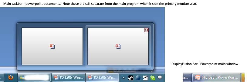 I did a search but couldn't find anything relating to this so I thought I'd bring it up. PowerPoint 2007 has some odd functionality where it creates an document task in the taskbar for each open document in addition to the main window (which is the only one with a preview). Selecting any of those tasks merely changes which one is displayed in the main window (I assume this is designed entirely for the combined button mode, though the lack of previews baffles me a bit). The issue relates directly to the extra document tasks.