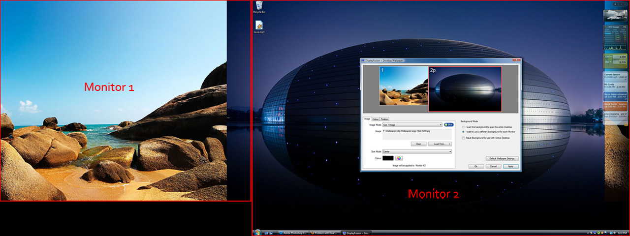 On the left I have a 19" 1280x1024 monitor. On the right, I have a 24" 1920x1080 monitor. With my trial copy of UltraMon I can setup different wallpapers for each monitor as long as I have the correct sizes. However, with DF, I'm getting some weird results. Take a look at the attached screenshot...