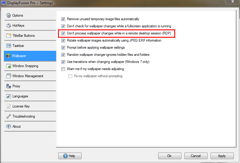 DisplayFusion works great except with I connect via remote desktop from my laptop. I have Remote Desktop setup to turn off all features on remote desktop in order for things to work faster. The problem is that the wallpaper is tiled at the size of my laptop after I exit a remote desktop session. When I log back into my desktop I have to open displayfusion desktop wallpaper again and click apply, which then streches the wallpaper across the four monitors again.