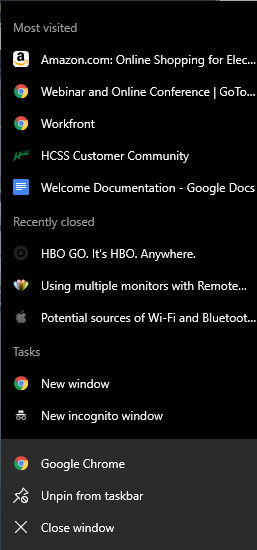 I recently transitioned from a laptop to a desktop (both with a 3 monitor setup) and when I right-click on Google Chrome from either of my two non-main monitors, I do not get contextual options as I did before (i.e. New Window, New Incognito Window, Most Visited, etc).