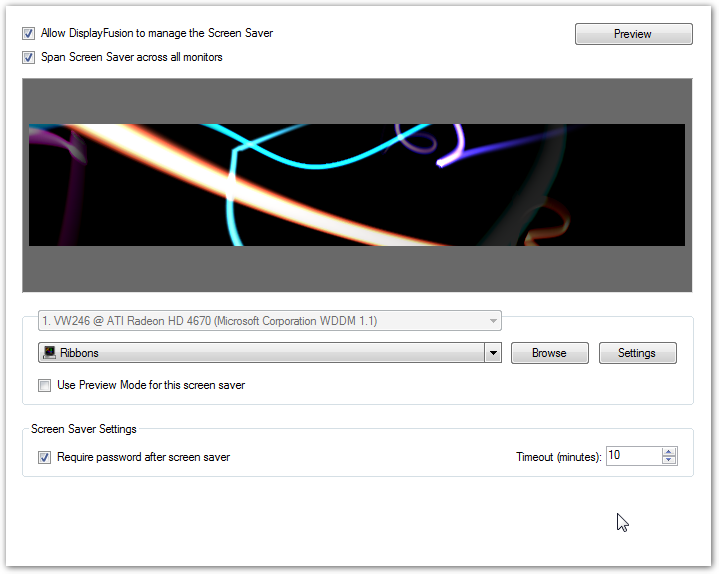 Instead of running the screen saver directly, DisplayFusion will create a window that's the size of your screen, then call the screen saver in preview mode and pass the handle of the window to it. That's the only way to make the screen savers span both monitors, or to run a different screen saver on the second monitor. Generally, most screen savers can only run on the primary monitor without using preview mode