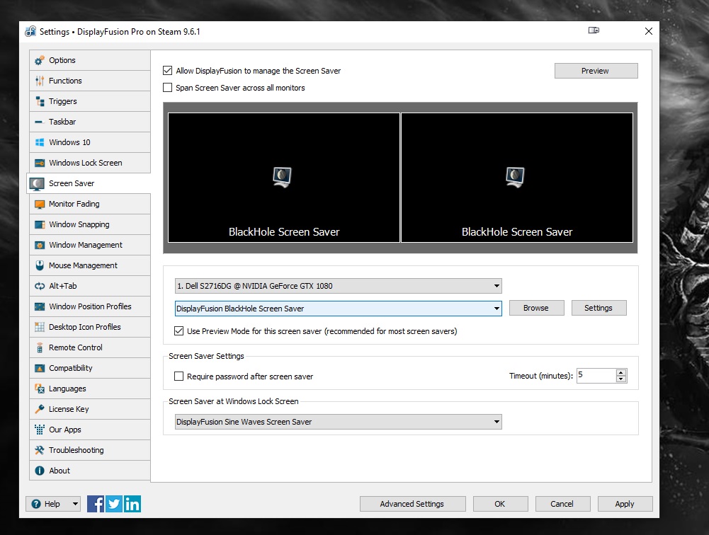 The issue now is that the screensaver isn't starting, even after restarting. Well, technically you could say it's starting but has a thumbnail in the top left corner of my main monitor that is blue with a monitor showing a cresent moon (included a screenshot of what is showing up since it shows it under the Windows screensaver settings). Any ideas on what could be in essence blocking DisplayFusion's screensaver? I've doubled checked both Windows and DisplayFusion's settings but have had no luck. The issue also just started this past weekend and seems to get a little worse each time it happens (thumbnail showed up yesterday for the first time).