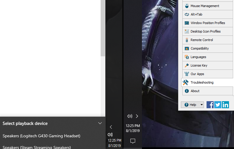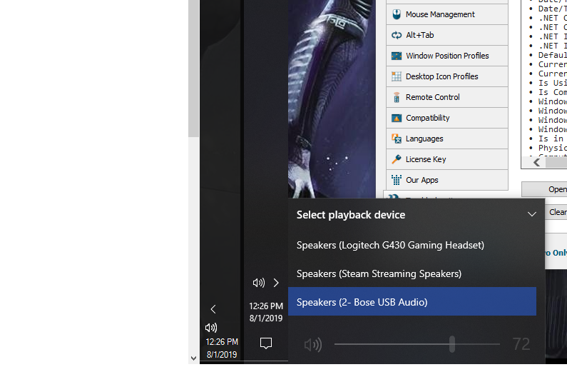 Hi there, I've got two taskbars set vertically in the center of a dual-monitor setup, with the system tray along the bottom. When I open the audio output selector in the Windows default taskbar system tray, the options list extends upward (see screenshots), showing me all the options. In the DisplayFusion taskbar system tray on the secondary screen, the menu extends downward, off the screen, obscuring some of the options. Is this a setting that I can change, or a bug in my setup?