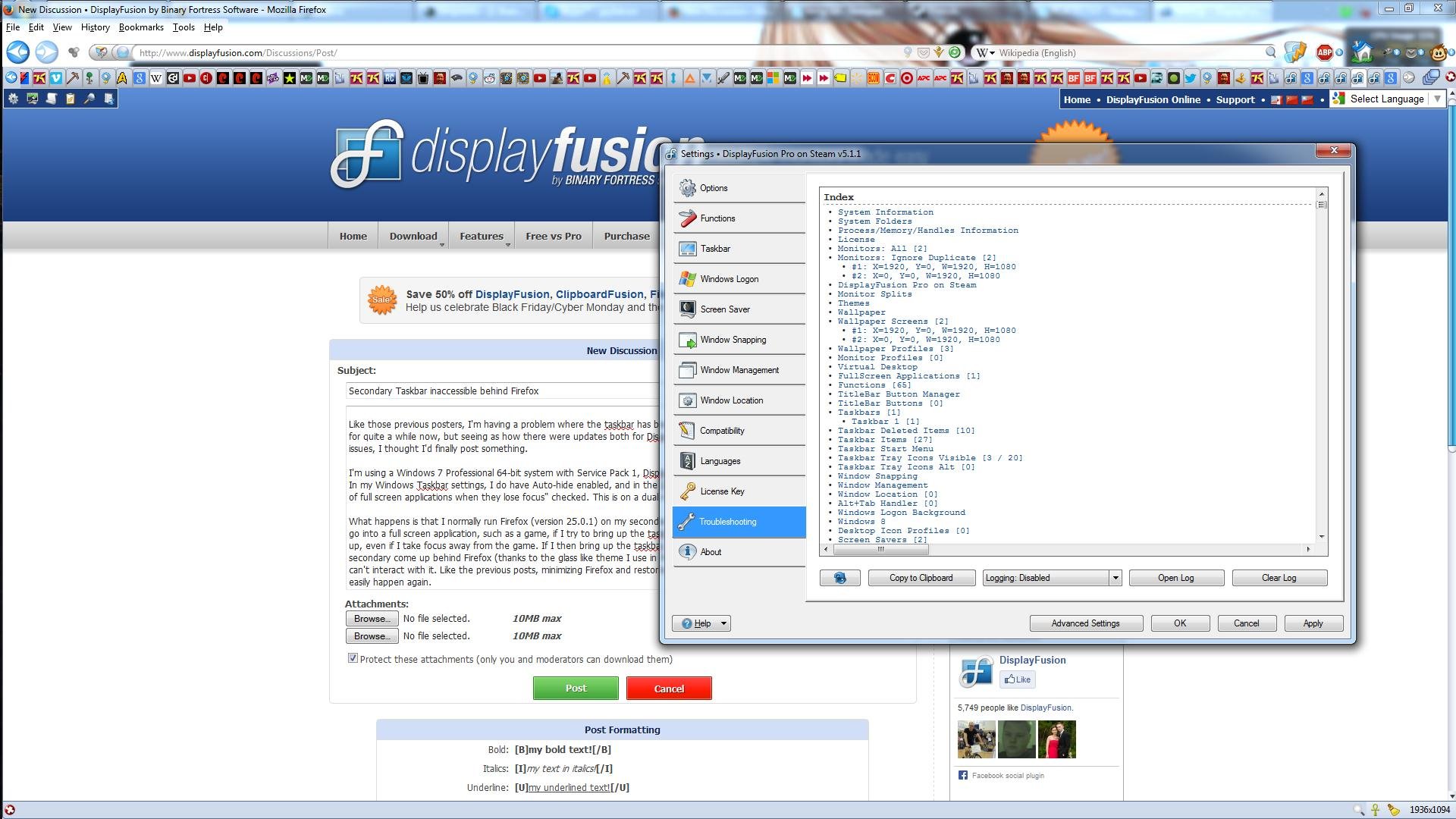 I've attached a screenshot of the taskbar behind Firefox as well as a copy of the contents of the Troubleshooting tab in DisplayFusion, taken a few seconds after the screenshot.