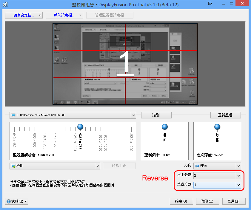 Vertical Split: Creates a horizontal split line, but it's splitting the vertical area of the monitor into sections.