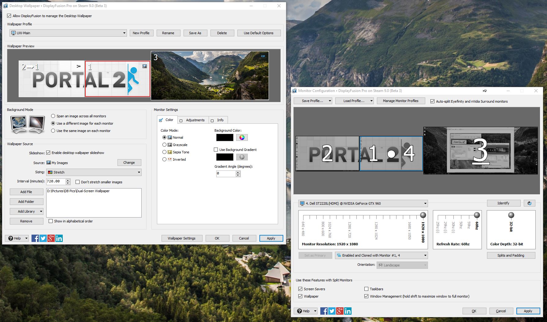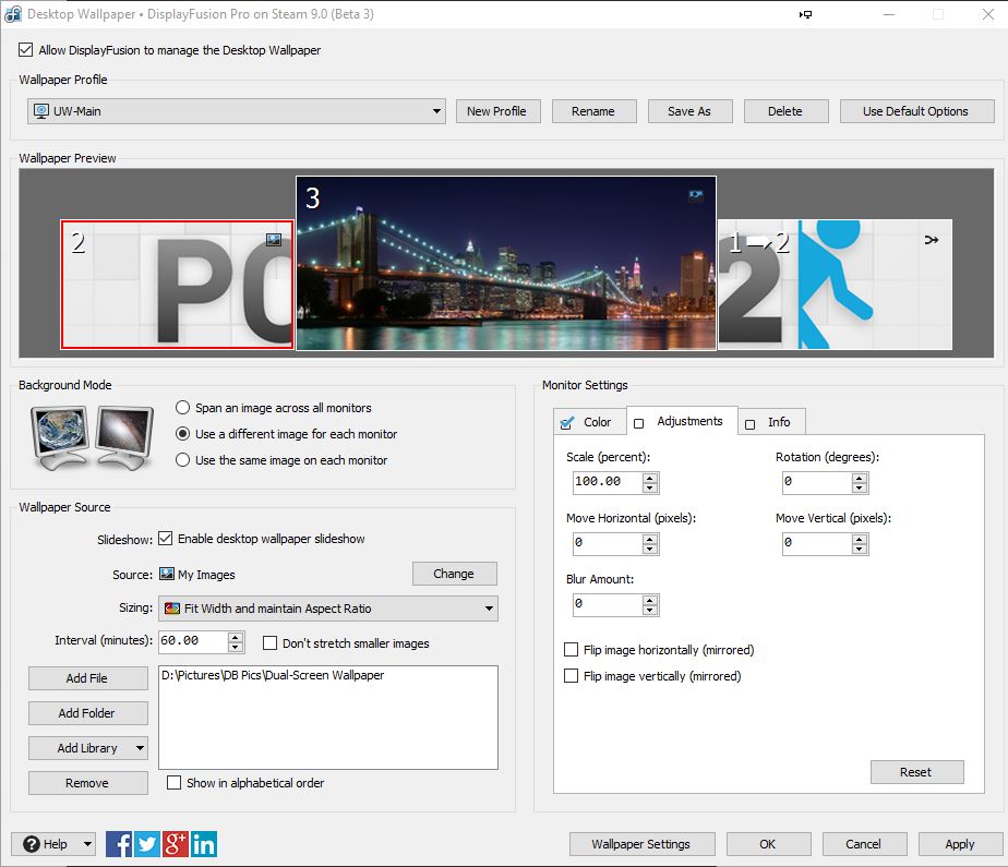 The center-placed ultra-wide screen should NOT have an impact on how the image is displayed on the other two monitors in my opinion, since the two side monitors are set to combine with each other ONLY, and does not include the ultra-wide, which is set to pull images from another gallery by itself. This appears to be a flaw in the program that needs to be addressed if possible. The program shouldn't care where the two monitors are in relation to each other, only that they're supposed to combine the image across the two monitors as defined, whether it's a double or trip screen configuration. I realize this may cause issues with a triple-screen setup and one image spanning across three monitors, but refinements to the combine feature should be made so this is function is more robust and intelligent (i.e. combining two monitors vs three+ regardless of position).
