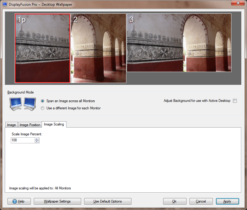 But for my particular setup, I don't need grouping of monitors, and I'm happy using the same wallpaper on 1+2 and on 3. I also don't mind a little bit of cropping. By setting the wallpaper to Tile and changing the Image Scaling to 108%, I can almost get it to fit. But the scaling is restricted to whole numbers, so the seam doesn't quite fall on the boundary between monitors 2 and 3. If you enter a decimal, it is rounded to the nearest integer when you tab out of the text field.