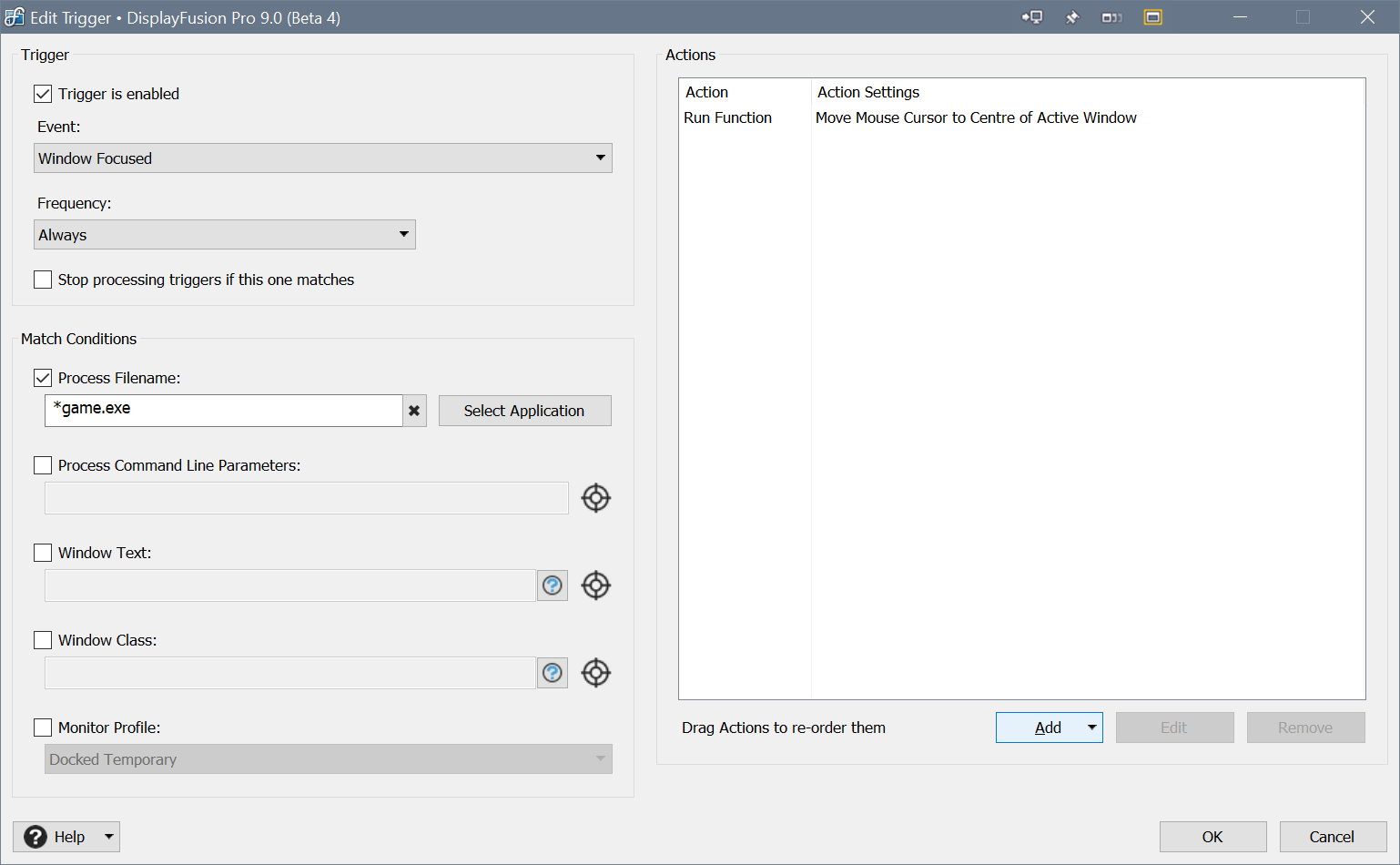 You could try creating a Trigger rule for the game on the second monitor like the one in the attached screenshot. The rule would detect when the game gets focus, and run the "Move Mouse Cursor to Centre of Active Window"