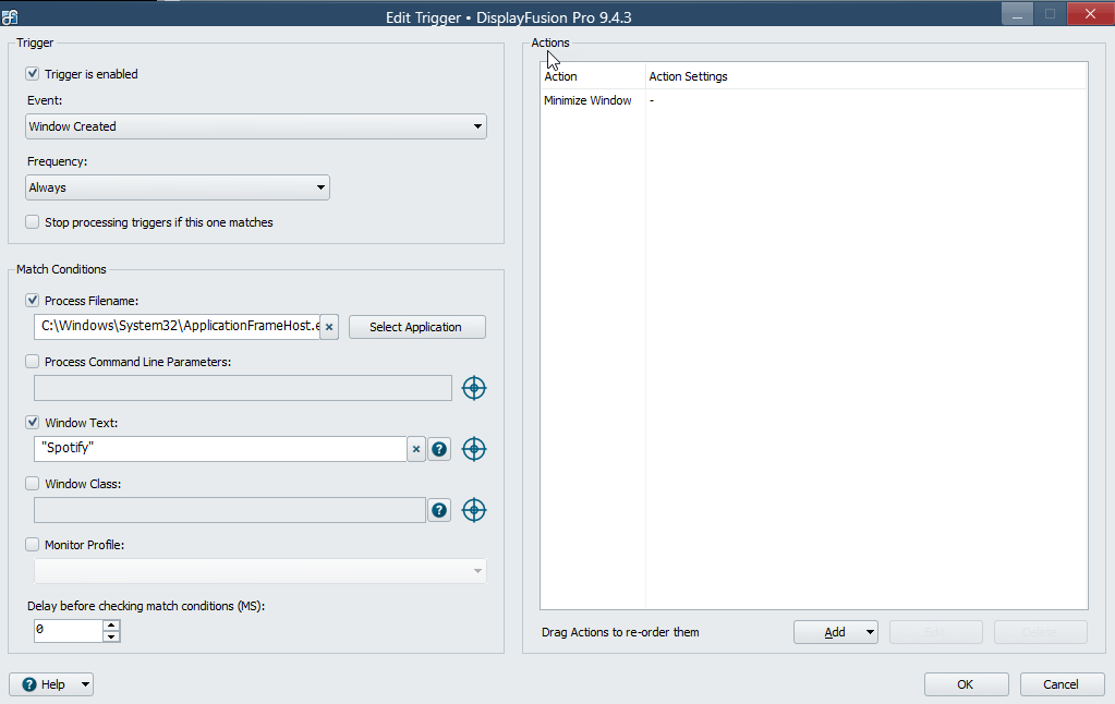 Use C:\Windows\System32\ApplicationFrameHost.exe as the process path, and then put "Spotify" in the Window Text condition. If that doesn't work, can you attach a screenshot of your Trigger rule?
