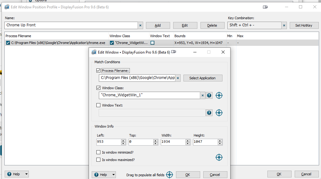 I have a very simple "Chrome Up Front" window position profile. It simply pulls up my active chrome tabs front and center of my screen.