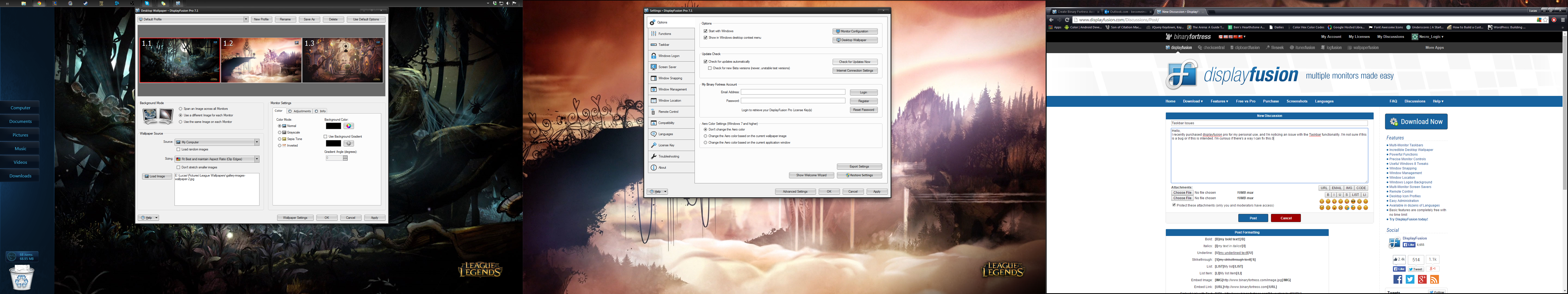 I recently purchased displayfusion pro for my personal use, and I'm noticing an issue with the Taskbar functionality. I'm not sure if this is a bug or if this is intended. I'm curious if there's a way I can fix this. The image attached show's my desktop. It is 3 1920 x 1080 screens. I currently only want the taskbar on the left most screen. However when I do this, the two monitors without the taskbar have empty space that will not get filled. notice with chrome it is full screened but not covering the entire screen. What can I do to fix this? I have the screens split via the monitor setting, and Have the latest drivers for my AMD graphics card.