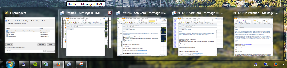 Basically I have 4x Outlook objects on my second screen. When I mouse over the grouped tile on the task bar I get them pop up with the usual preview, however its not only showing the outlook item it also shows an Excel window behind the Outlook item preview.