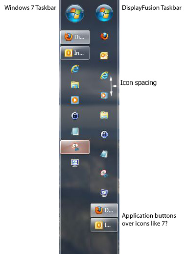 I have been evaluating DF for 2 weeks now and really like it. I am getting ready to push the purchase button. I have a couple of minor issues with the Taskbar, I admit I'm very picky. Can I adjust the icon spacing and have the application buttons placed over the icons (see the attached image)? Am I missing some settings or are these things not possible in DF Pro v4.0.1? If not possible maybe in a future version?
