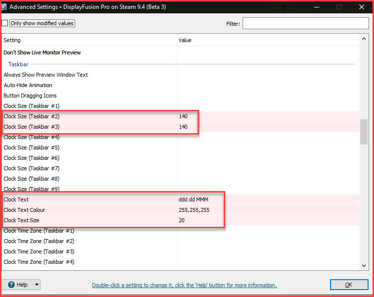 Below that you will see Clock text enter the text for what you want, you will find help here: https://www.displayfusion.com/AdvancedSettings/?Version=9.3.99.103#taskbar_clocktext