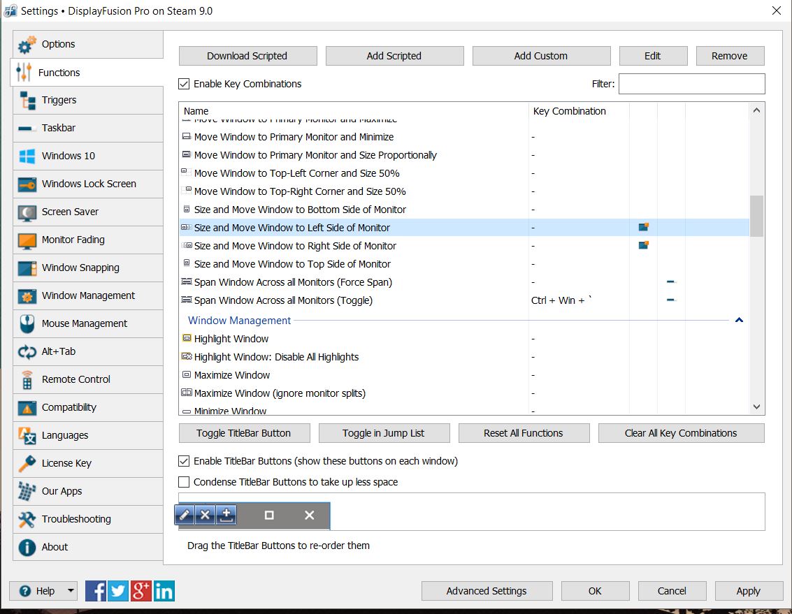 Also, I noticed in the Troubleshooting info that you have a value set for the "TitleBar Buttons: Icon Scaling" option in the Advanced Settings. Can you try clearing that value and restarting DisplayFusion?