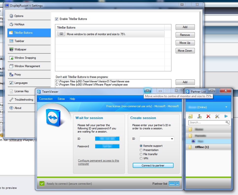 The exception doesn't work with TeamViewer 5 and VMware Player 3. The exception did work with VMware Player before I updated DisplayFusion however.