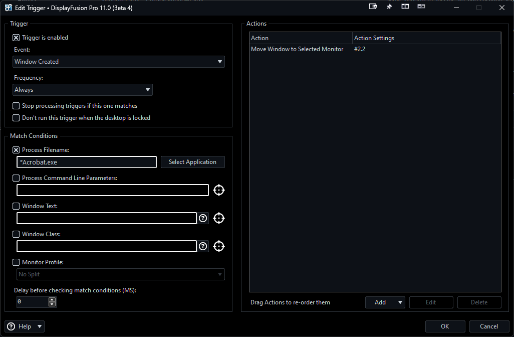 Sorry Keith, just saw your reply now. I deleted the two things I had tried and now I don't remember how I set them up to reproduce for you. Honestly, I'm overwhelmed with all of the potential functionality of triggers and just am not sure where to start. I will try again now and see if I can produce something to show you (or better yet, get it to work). The bottom line is that I just want PDFs to always open on a specific monitor. I'll reply again in a bit. Thank you for your response.