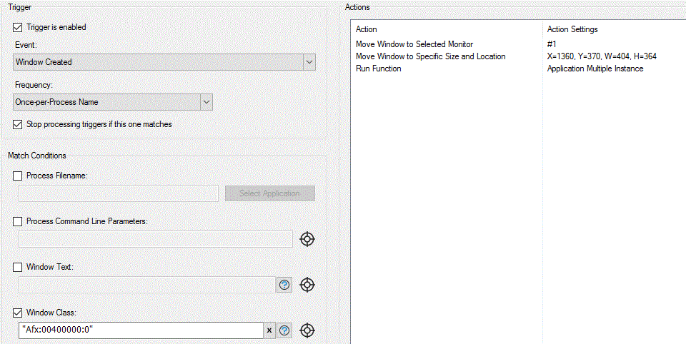 I try to create a trigger to automatically switch 6 instance of the same software on my second screen and place them in a defined order. As shown in the attached screenshot.
