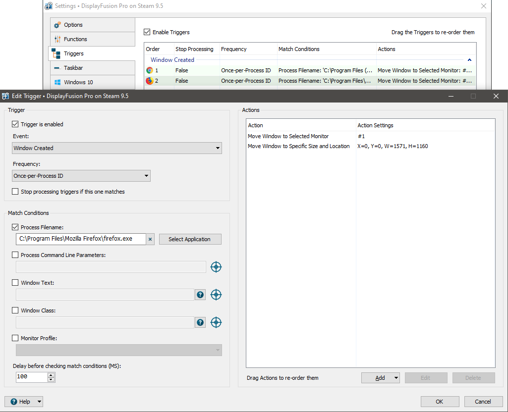 I was using Triggers to reset the window position of my browser everytime I start it. Now it only works for one time after I save the triggers in DisplayFusion. After that the triggers won't work anymore until I manually save the list of triggers again.