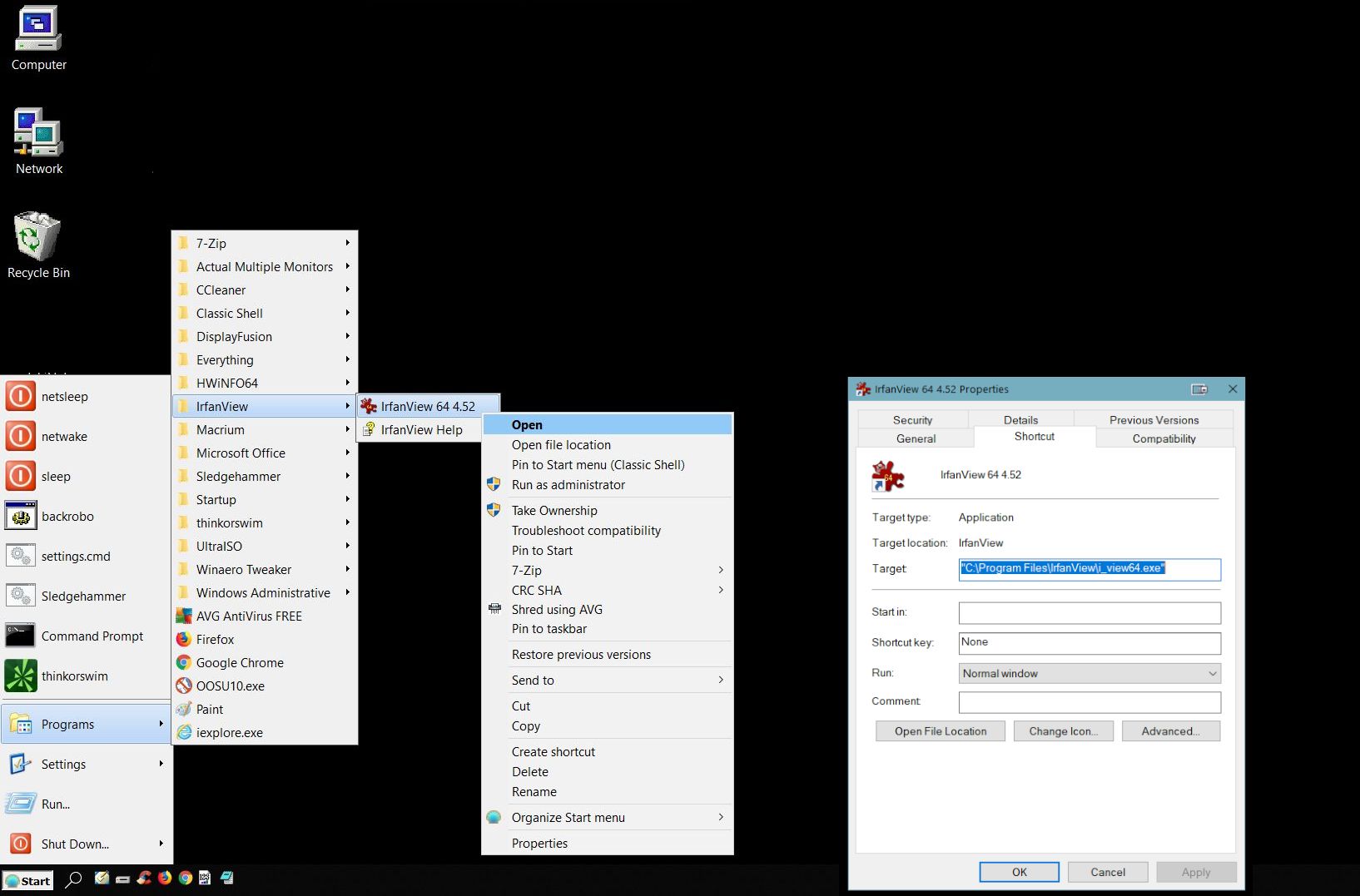 1) If I load irfanview by going into my start menu and navigating to the shortcut and INSTEAD of hitting left click like I normally would, but instead selected "right click-open" (I made a screenshot of it below to show what I mean), the program load instantly AND the "move window to next monitor button" ALSO loads instantly. Further, going to the actual program file using explorer and clicking on the exe file directly (whether with a left double click OR a right-click-open) ALSO loads both the program and the move window button instantly.