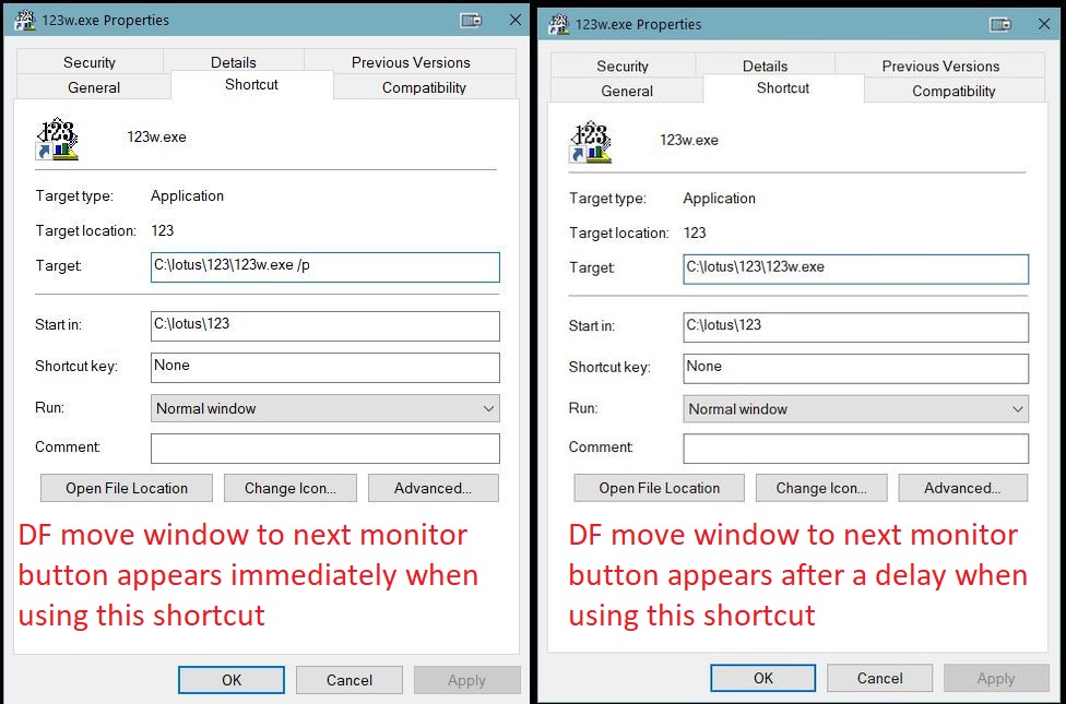 Edit #2: Everything within 1) & 2) above also applies to lotus 1-2-3. It also applies to firefox IF I use a blank page as my home page. But if I use an internet page as the home page (mine is www.google.com), the move window button appears only after a delay no matter whether I start it from a menu shortcut or even using right-click-open on the exe file. It appears the menu button waits for the page to load no matter what. And yet on chrome and IE, the move window button appears instantaneously, prior to the home page loading, no matter what method I use to start the program.