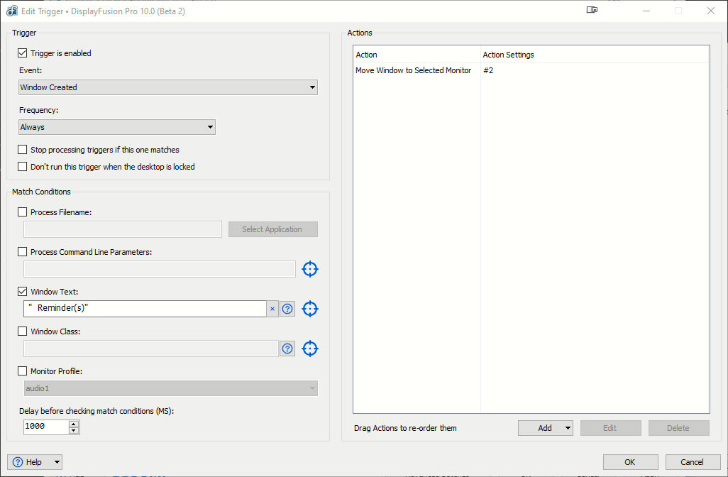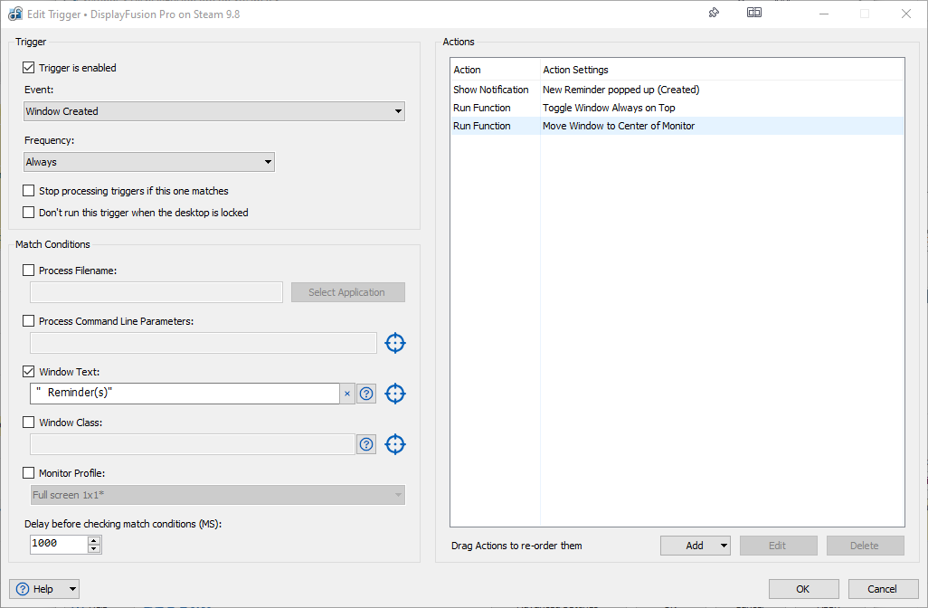 I want to create a trigger that makes the Outlook Reminders dialog pop up on top and center whenever one or more reminder(s) are due, but I have been unable to make anything work except the 'Focused' trigger, but that one is kinda useless, because it means I first have to find and click it to begin with.