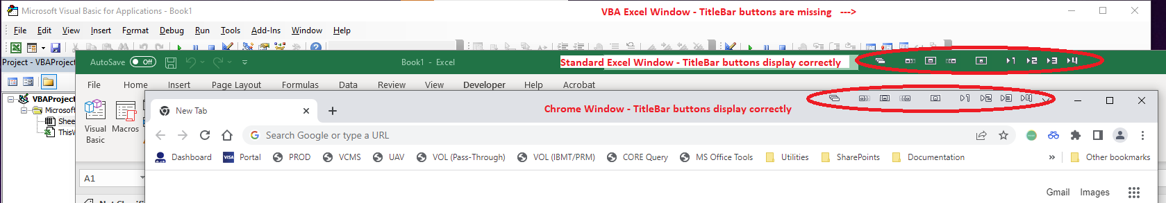 I've included a screenshot with an overlay showing my Excel workbook window, the VBA window and a Chrome window for reference. The issue only occurs with Excel. If I launch the VBA editor through MS Word the TitleBar buttons display as expected.