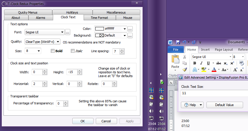Edit: Added a second shot, showing the settings, and also MS Word showing the same font&size to show that DF is doing something wrong with the specified font size. It also shows that T-Clock is using a much nicer font rendering method than DF, which seems to be contributing to the feeling of not matching.