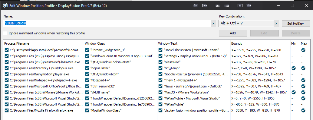 I am investigating Window Position Profiles but for some reason VS does not get moved to the correct posion.