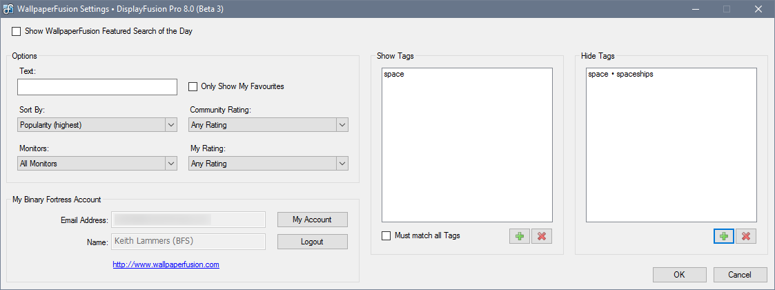 I do not know if I just do not know how to do something, or if this is a feature request. When I set up displayfusion to use WallpaperFusion for my wallpapers, I try to do a search for images that only involve space (planetscapes, Hubble imges, etc...). The issue is that it pulls in anything with the word "space", so I get images of an airplane carrying a space shuttle. I am able to do a google search that just brings in those images, but I would rather use WallpaperFusion. Is there any way to set the search so that it just pulls the types of images I want? If so, how do I go about it? If not, I would like to make this a feature request.