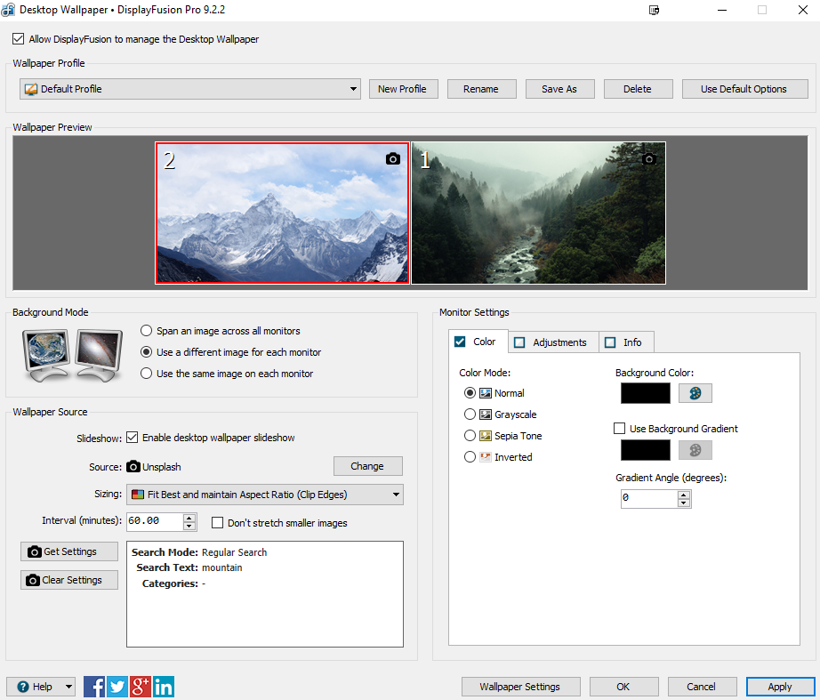 Every so often my two monitors will show only whatever's set for monitor 1, even though my wallpaper settings are set to "use a different image." As you'll see in the screenshot, I've got it set up right, and yet both monitors are showing the same image. If I do "span an image," then both show only half of the image. This isn't always the case, but I'm not sure what's going on. Thank you!