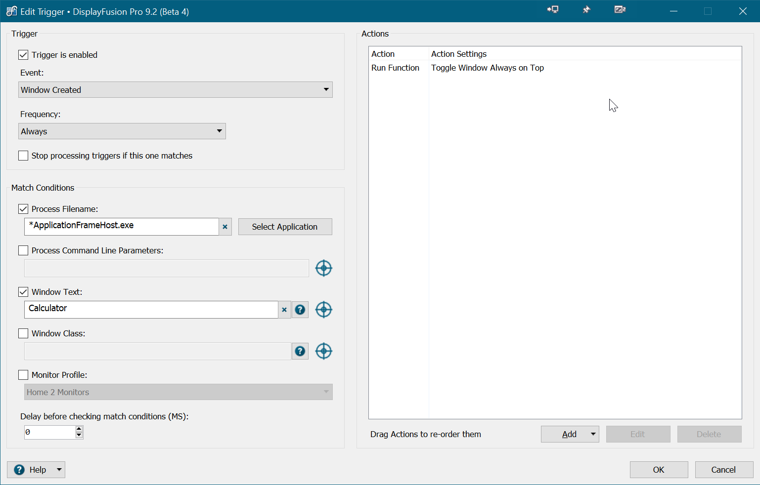 Ah ok, could you enable update checks on the DisplayFusoin Settings > Options tab, then click Check for Updates to update to 9.2.2? It should then have the match conditions delay option in the Trigger edit window.