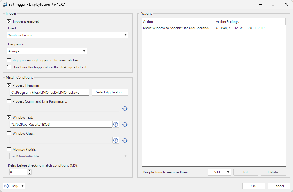 I’m using Windows 11 (25H2 26200.7623) and DisplayFusion (12.0.1) and I’m trying to automate the size and position of the undocked LINQPad Results window for LINQPad 5 (5.52.01) and LINQPad 9 (9.5.10).